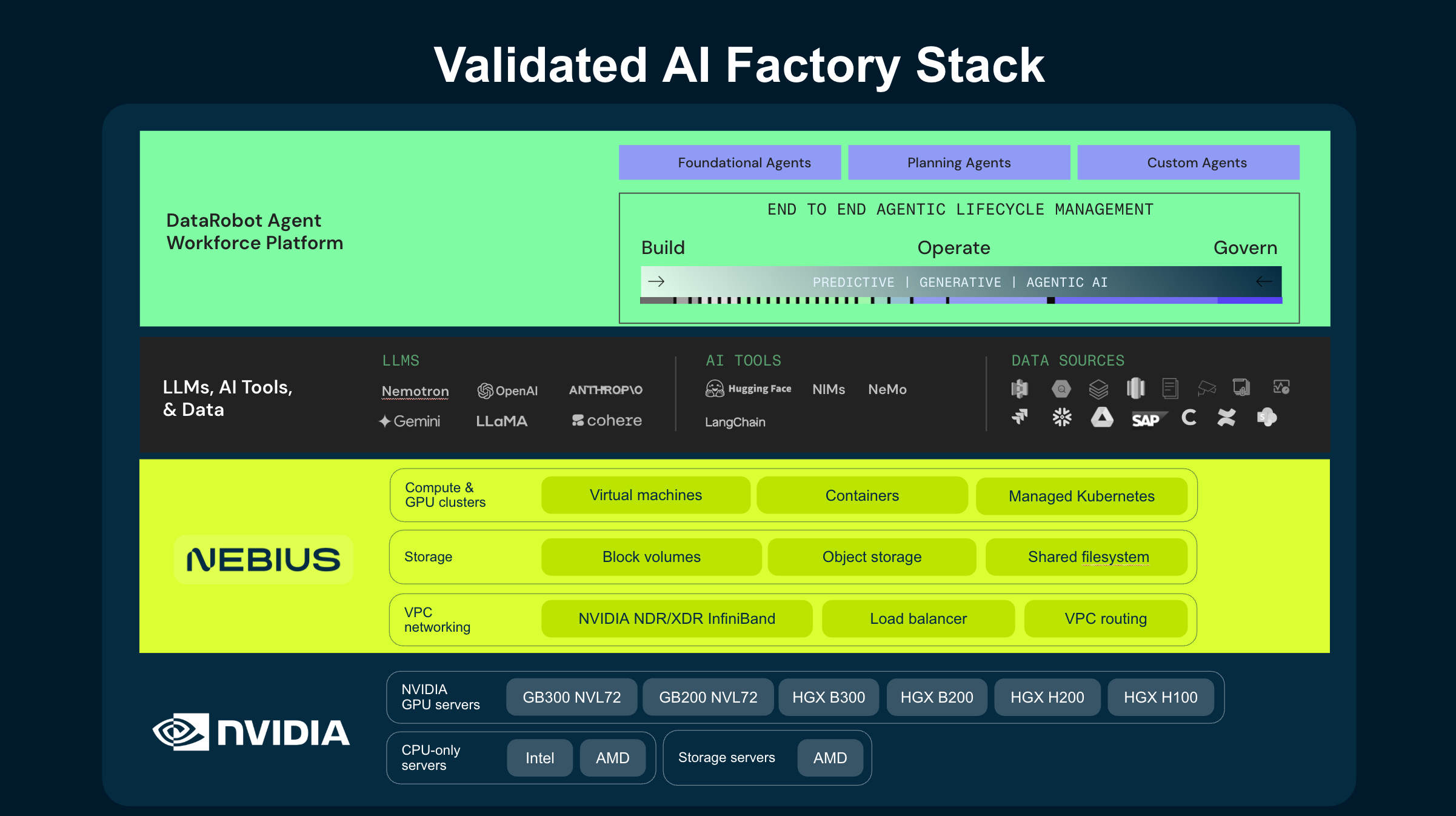 The DataRobot Agent Workforce Platform, co-engineered with NVIDIA, is now supported on Nebius AI Cloud through a validated configuration optimized for running agent workloads in production environments. This brings together comprehensive agent lifecycle management and a validated AI Factory stack purpose-built for sustained token throughput, ultra-low latency, workload isolation and production grade elasticity with end-to-end governance.