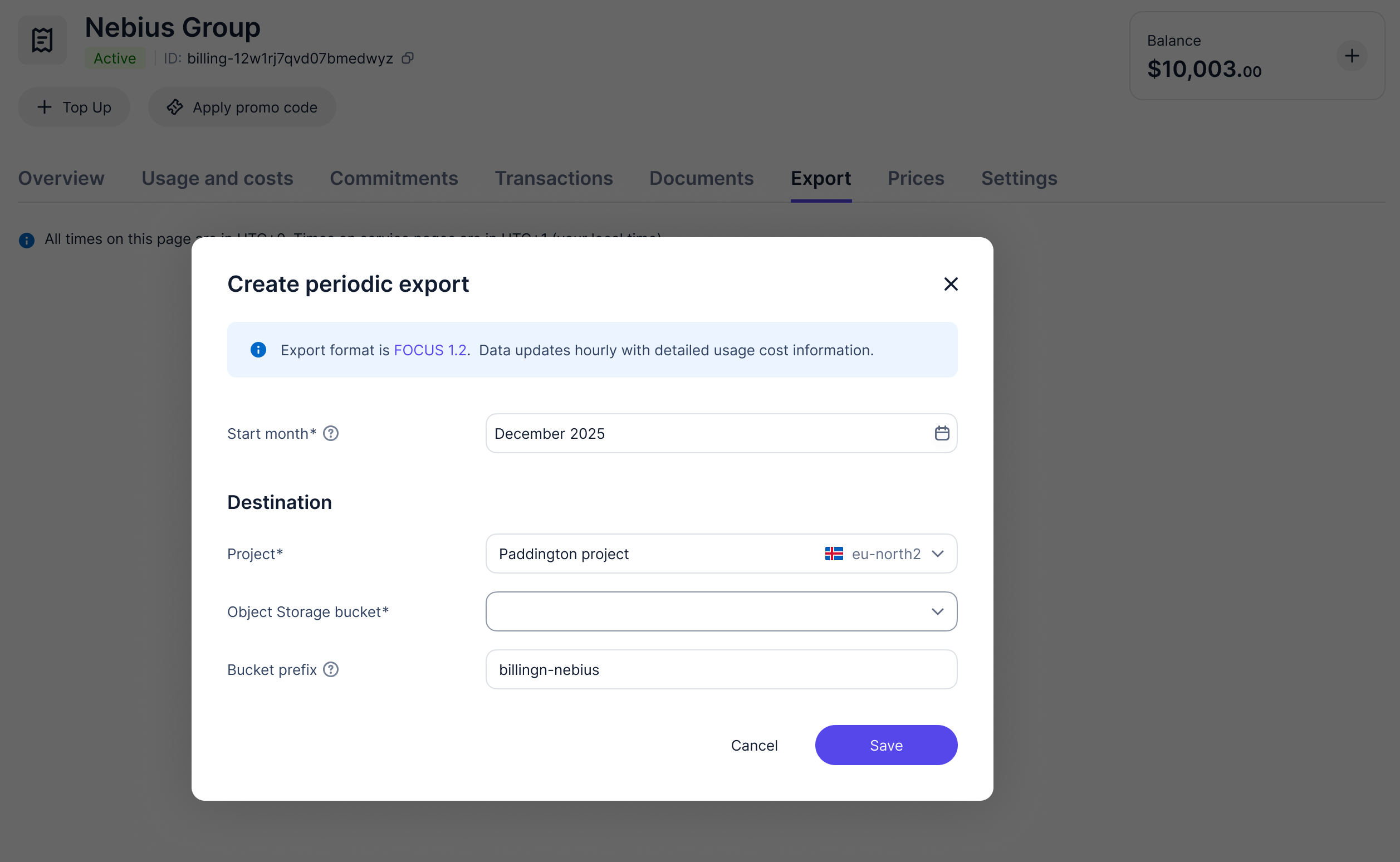Figure 1. Configuring a billing export from the Nebius web console
